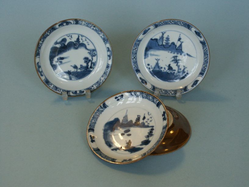4 schoteltjes met decor van rivierlandschap, cafe au lait, onderglazuur blauw