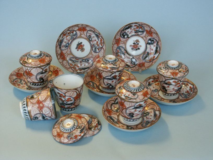 14 Kop en schotels met 13 deksels en met decor van rivierlandschap, lotusranken en bloemen