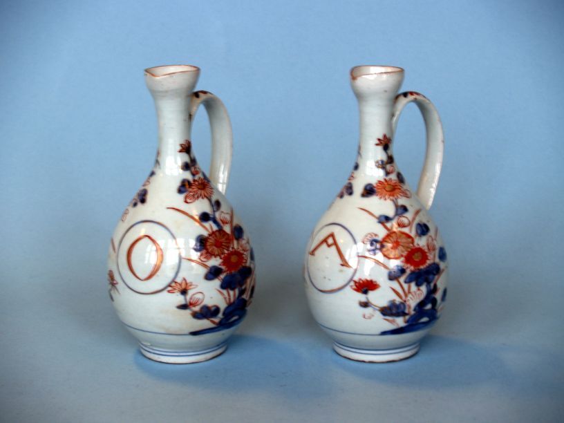 2 kannen met decor van ranken en blauwe cirkel waarin de letters O en A, imari