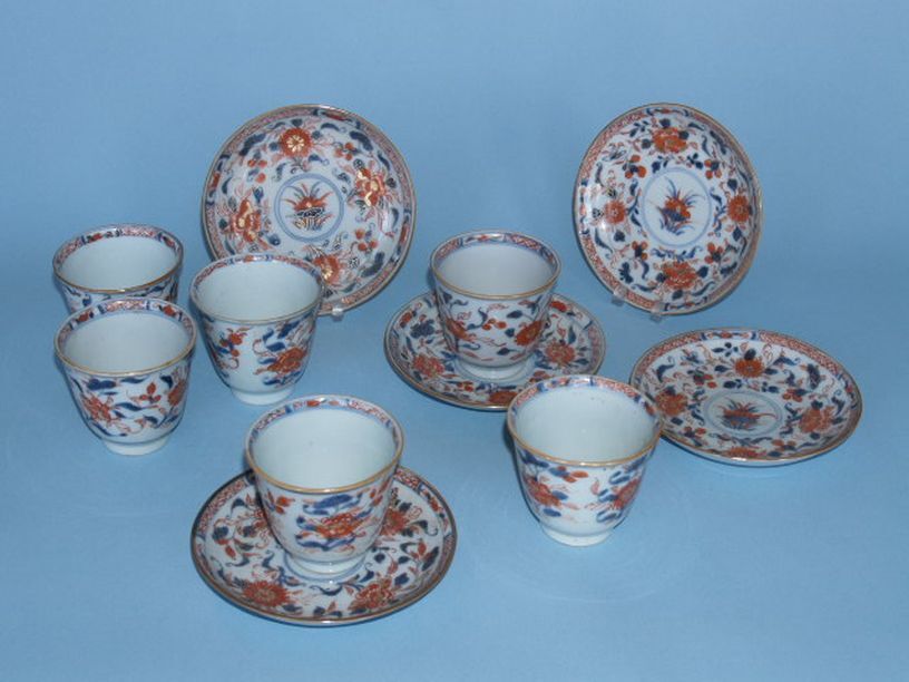 6 koppen en 5 schotels met decor van bloem- en bladmotieven, imari