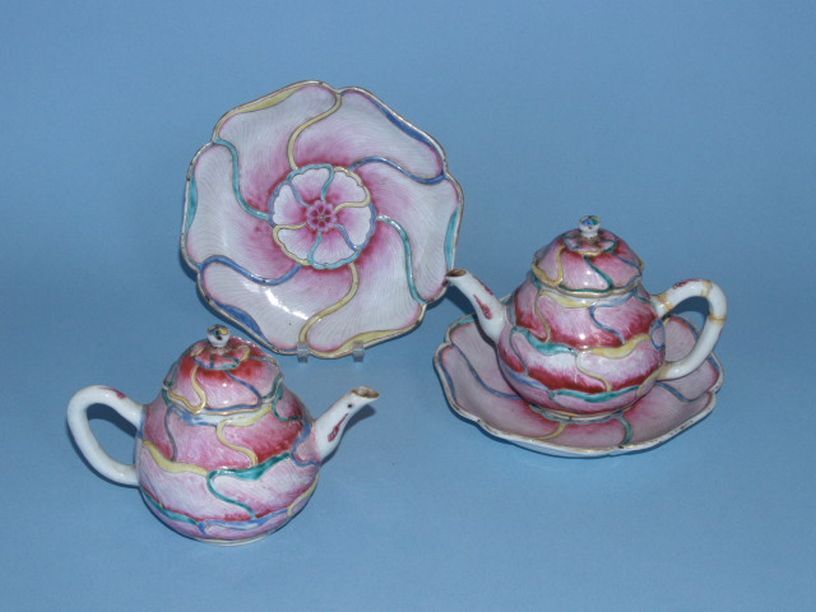 Set van twee theepotten met deksel en onderschotel, famille rose