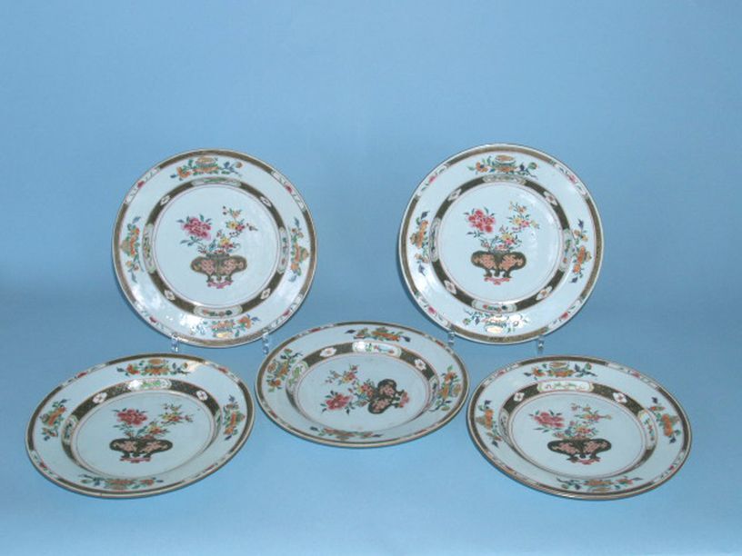 5 Borden met decor van bloemen, famille rose