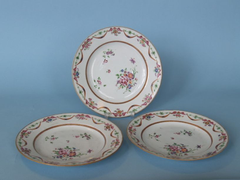 3 Borden met decor van bloemboeketten, famille rose