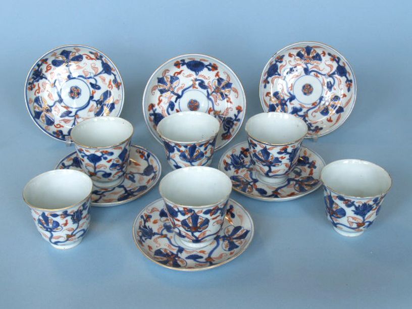6 kop en schotels met decor van rozet en krullende ranken, imari