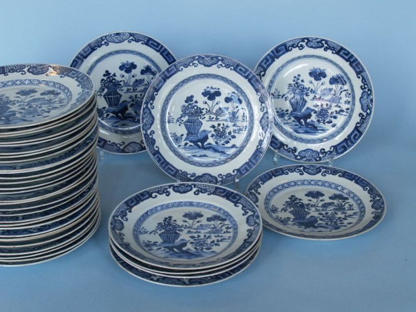 38 borden met decor van bloemenvaas op rots, chrysant en pioenroos