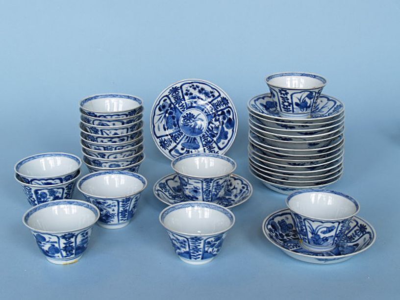 20 schotels en 22 kopjes met decor van medaillons met bloemen en vogel
