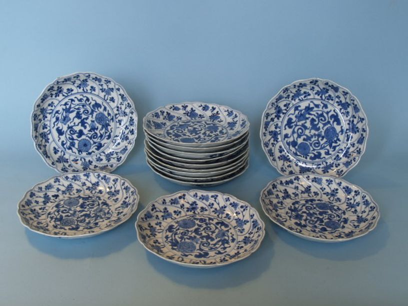 14 schalen met decor van chrysanten, pioenrozen en granaatappels