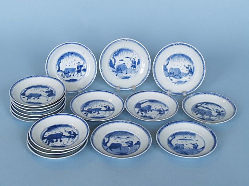 17 Schotels met decor van landschap met figuur en koe