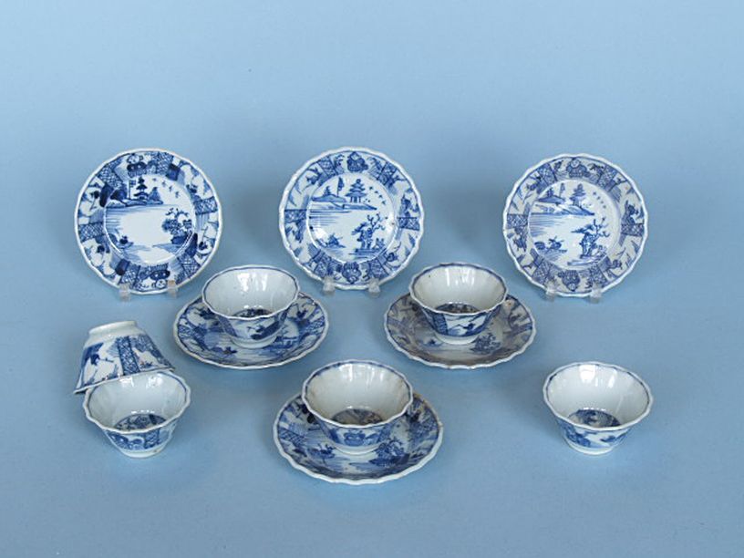 6 kop en schotels met decor van landschappen waarin figuren