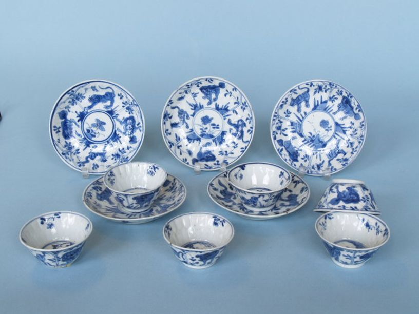 Vier kop en vijf schotel met decor van medaillon met bloem, omringd door tijger, qilin en boeddhistische leeuw