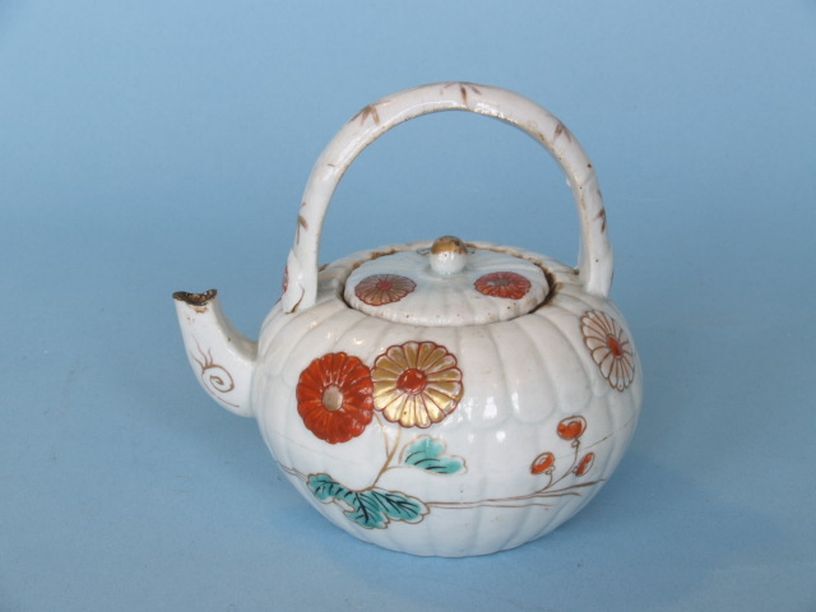 Theepot met deksel met decor van chrysanten en bladranken en met hengsel in vorm van bamboe