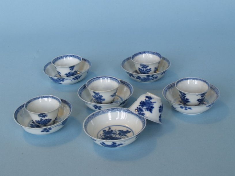 6 kop en schotels met floraal decor in onderglazuur blauw