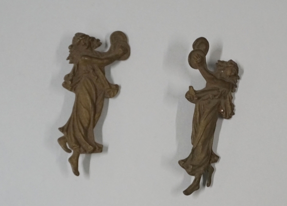 Twee beslagstukken in de vorm van twee dansende vrouwen in lange gewaden, slaande met cymbalen en elkaar aanziende