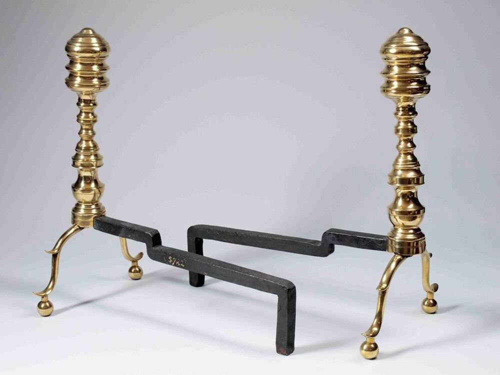 Twee haardijzers met elk twee gedraaide koperen voorstukken