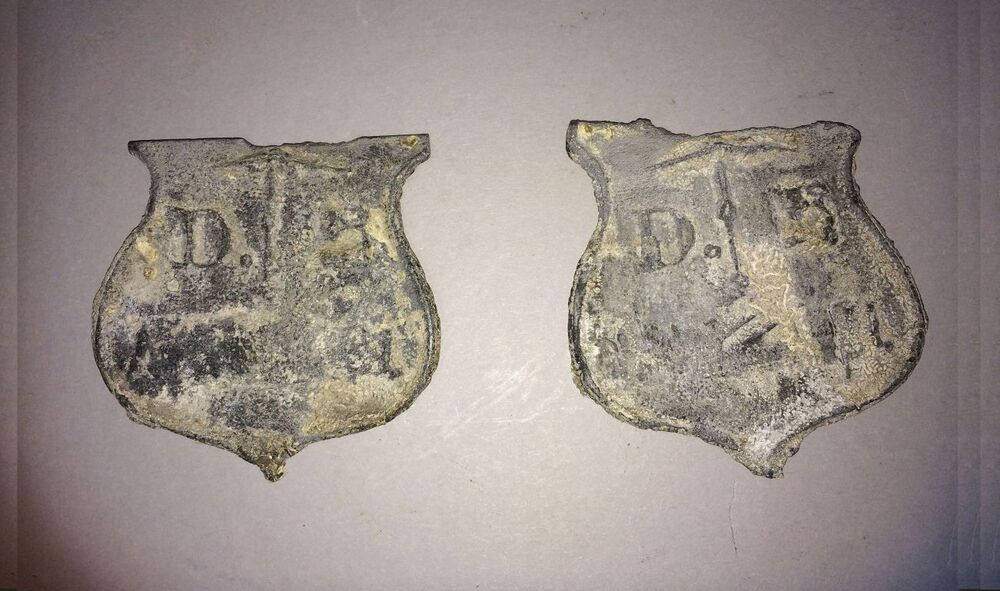 Drie trotseerloodjes in schildvorm waarop en relief een leidekkershamer en initialen