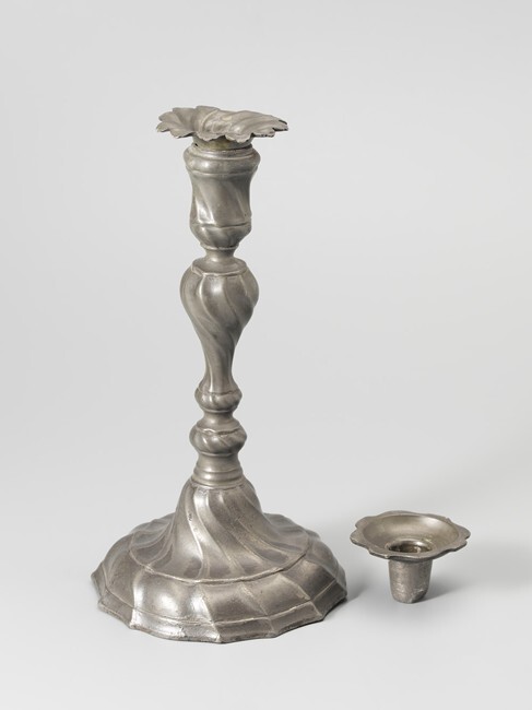 Tinnen kandelaar met losse vetvanger op ronde voet