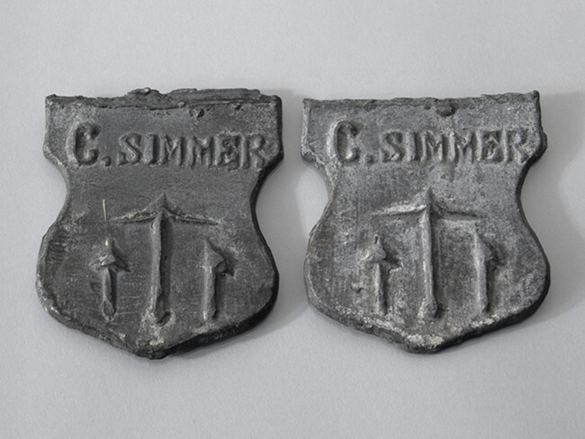 Twee trotseerloodjes in de vorm van een schildje waarop en relief C. Simmer met daaronder leidekkers of loodgieterswerktuigen