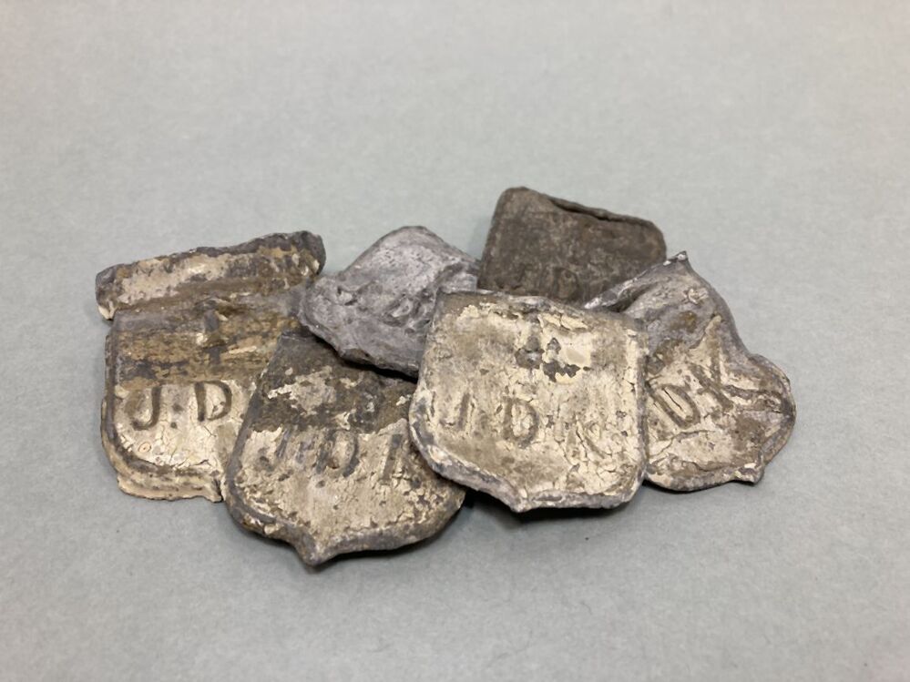 Zes trotseerloodjes. Vorm: wapenschild. Opschrift: J.D.K. met daarboven een afbeelding van een leihamer