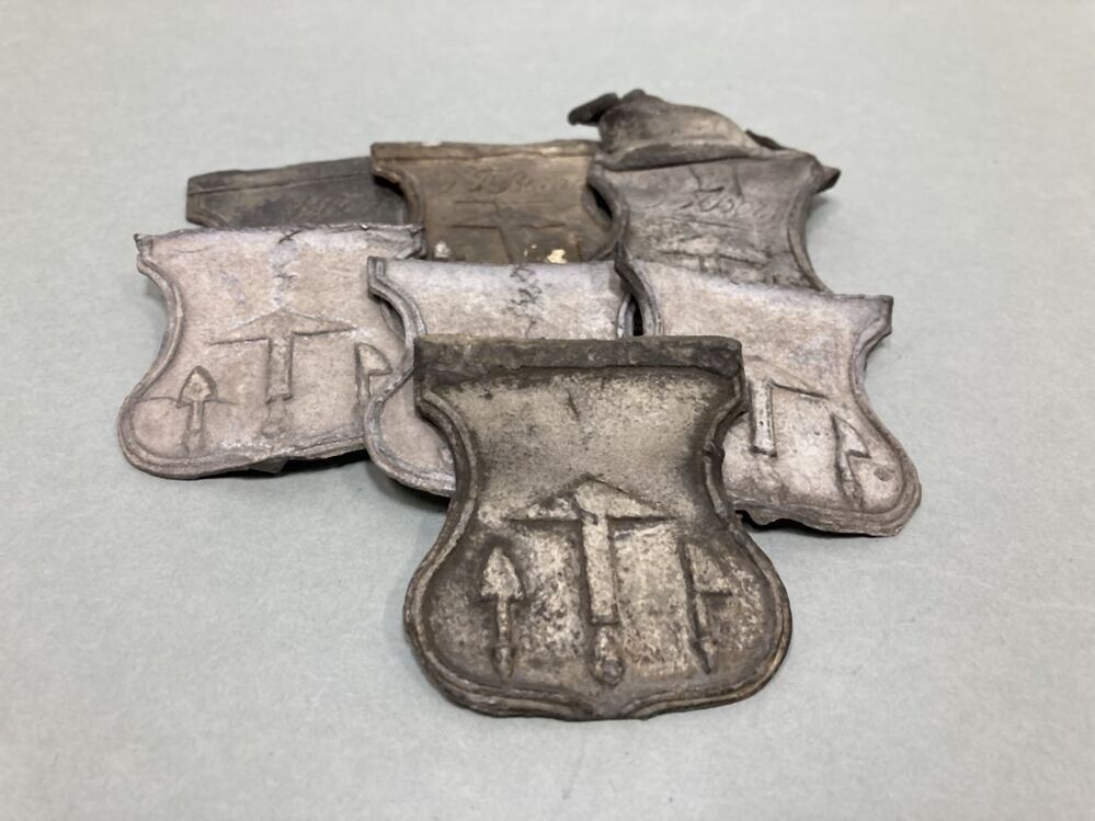 Zeven trotseerloodjes. Vorm: wapenschild. Opschrift: JT Born met daaronder afbeeldingen van loodgietersgereedschap