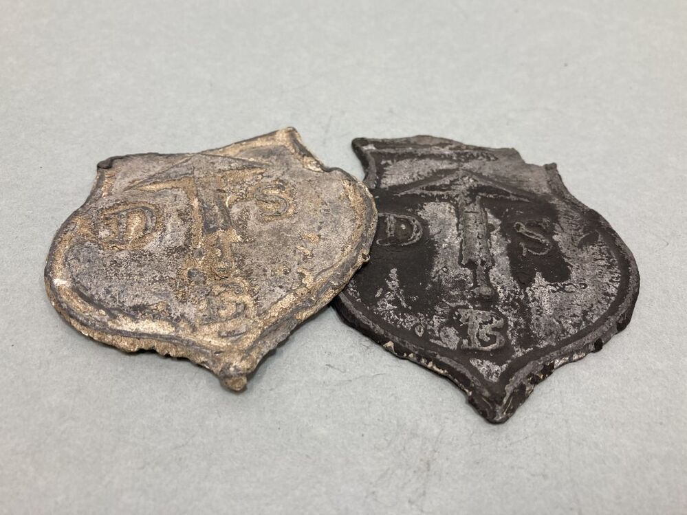 Twee trotseerloodjes. Vorm: wapenschild. Opschrift: DSB. Tussen de initialen een afbeelding van een leihamer