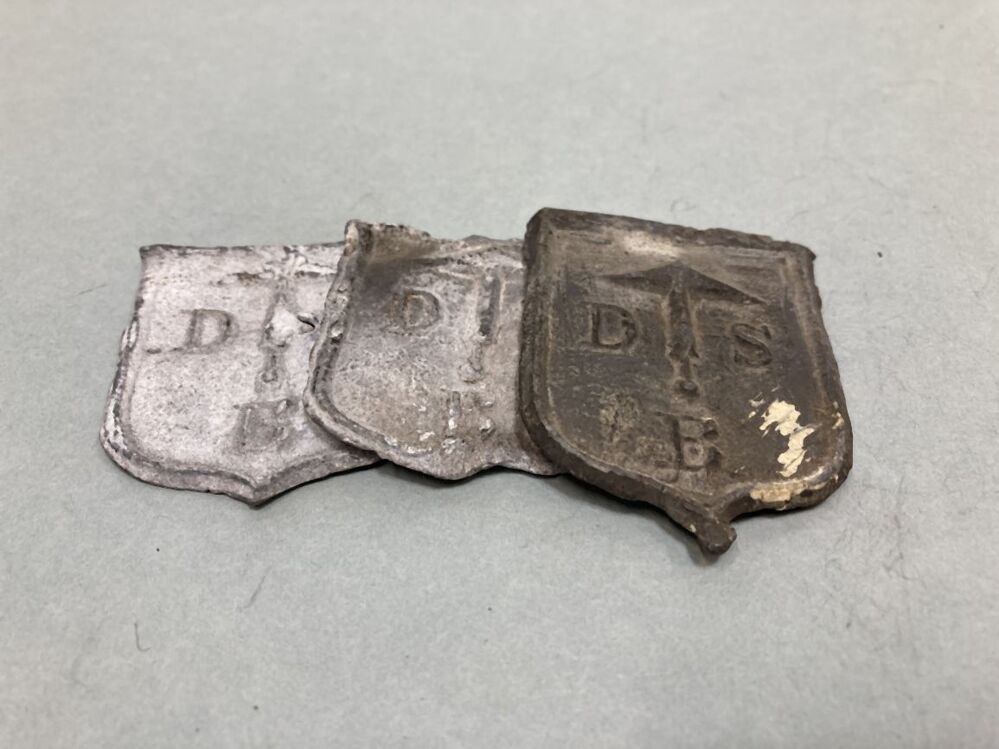 Drie trotseerloodjes (klein). Vorm: wapenschild. Opschrift: DSB. Tussen de initialen een afbeelding van een leihamer
