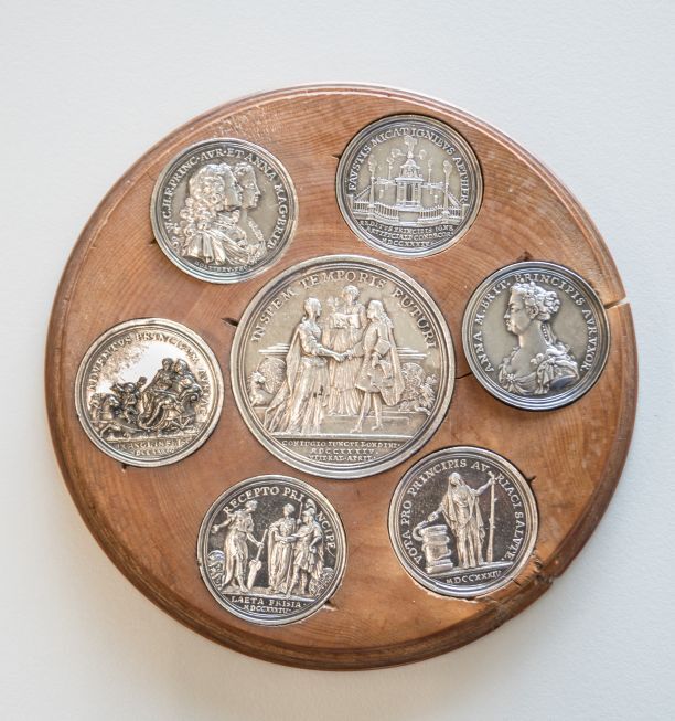 7 huwelijkspenningen van Willem Carel Hendrik Friso en Anna van Hannover in een houten houder