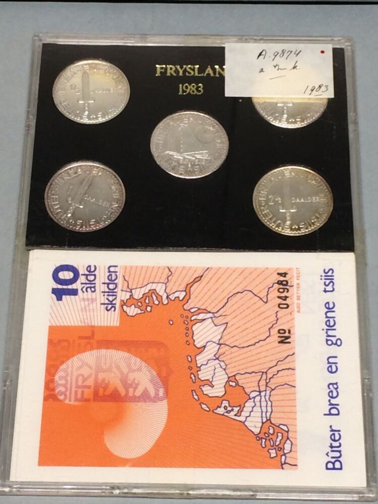 Muntenset met daarin 5 munten en 2 series van 3 stuks bankbiljetten