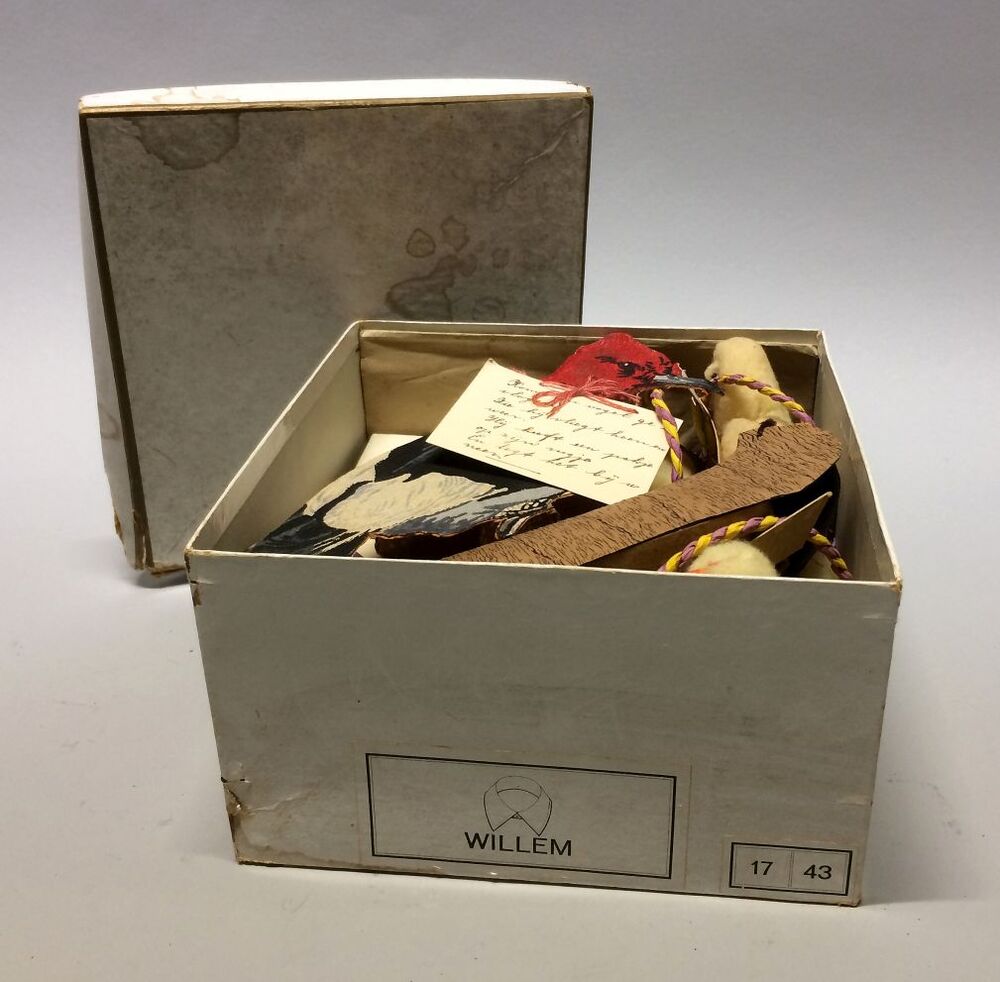 Eigenhandig gemaakte versiering voor de paastafel bestaande uit kuikens, eierdopjes, enz met boekje getiteld "Paaschklanken"