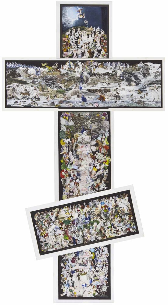 Beeldende werken die door middel van collagetechniek zijn vervaardigd, d.w.z. het maken van een tweedimensionale compositie door het opbrengen van objecten op een plat vlak. Gebruik 'fotocollages' als foto's de belangrijkste plaats innemen in de compositie. (AAT-Ned)
