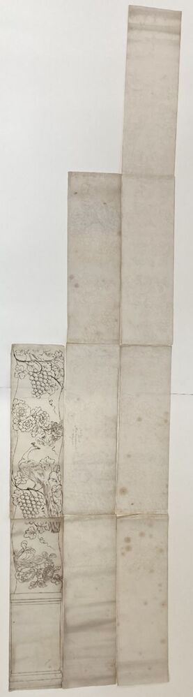 7 sponsen en 2 ontwerptekeningen voor een tegeltableau met een pilaardecor