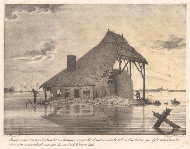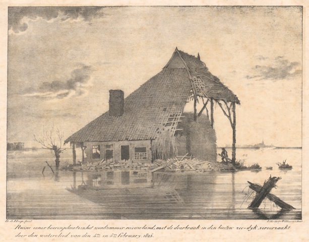 Twee lithografieën van een ruïne van een boerderij in het Workumer Nieuwland tijdens de watersnood in 1825