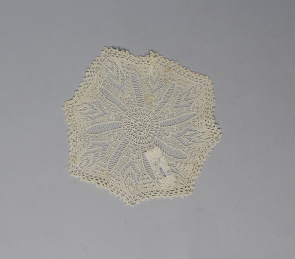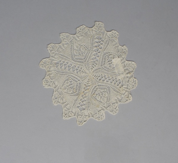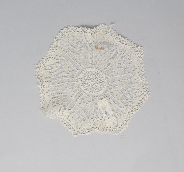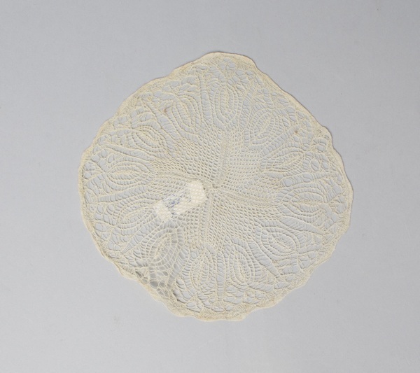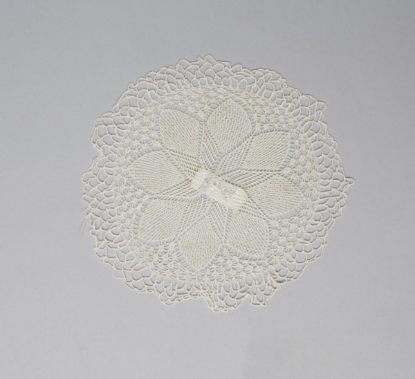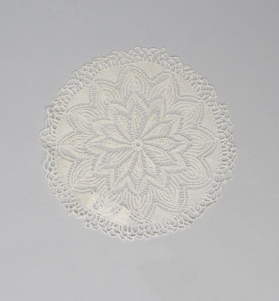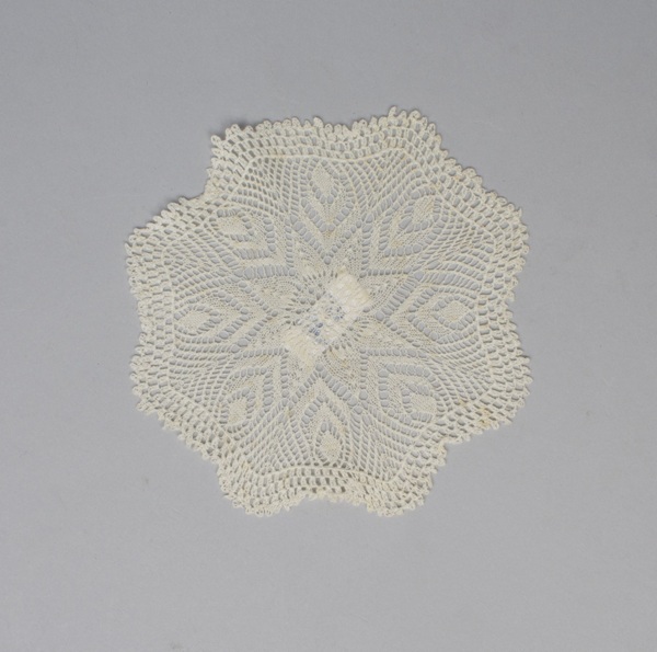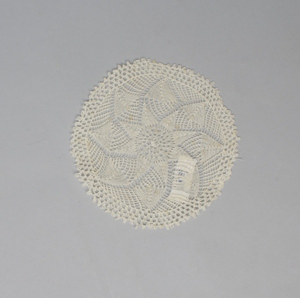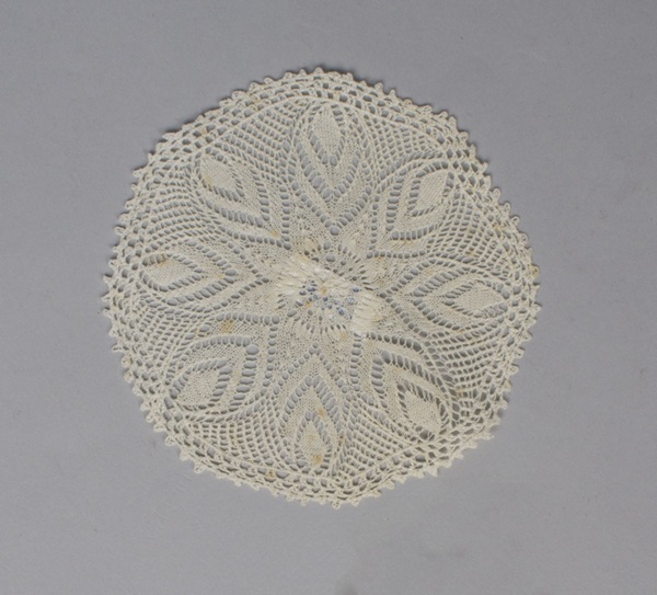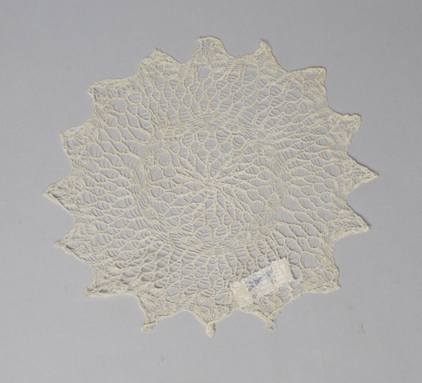 Elf bordenkleedjes ajour gebreid van wit katoen