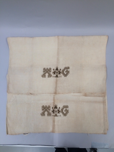 Twee slopen van wit linnen, bruin kruissteekborduursel, AG 1811