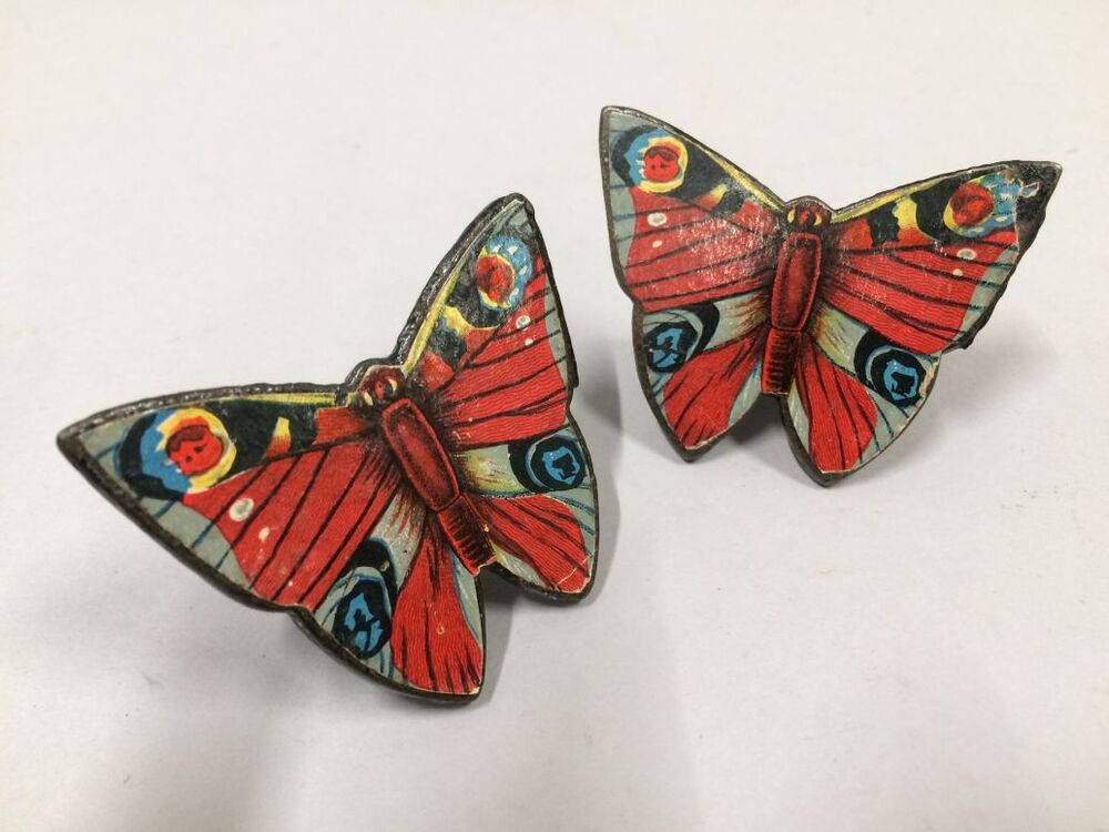 Twee rokgewichten in de vorm van een rood-blauwe vlinders