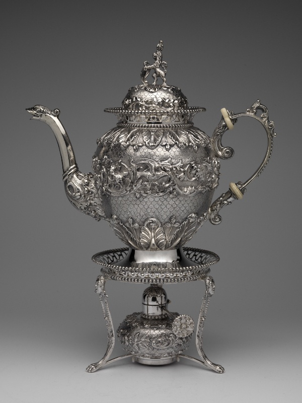 Zevendelig theeservies bestaande uit een blad, een theepot met komfoor, een suikerpot, een melkkan, een theebus en een lepelvaasje