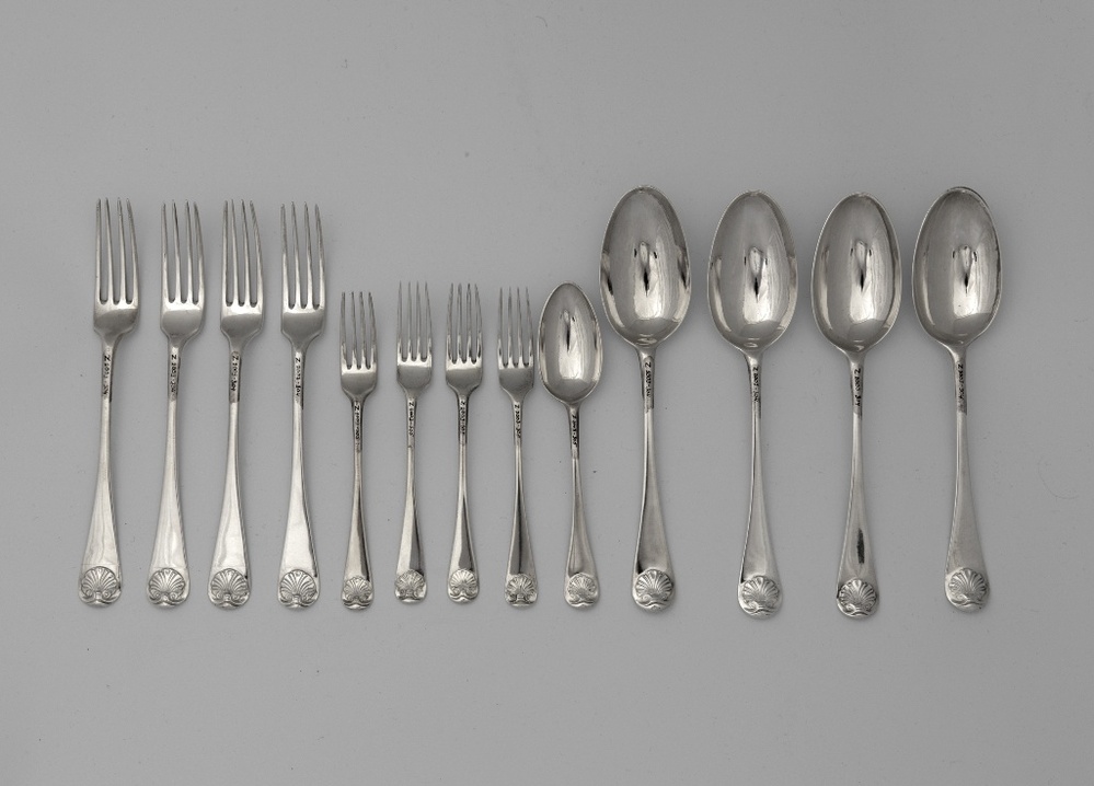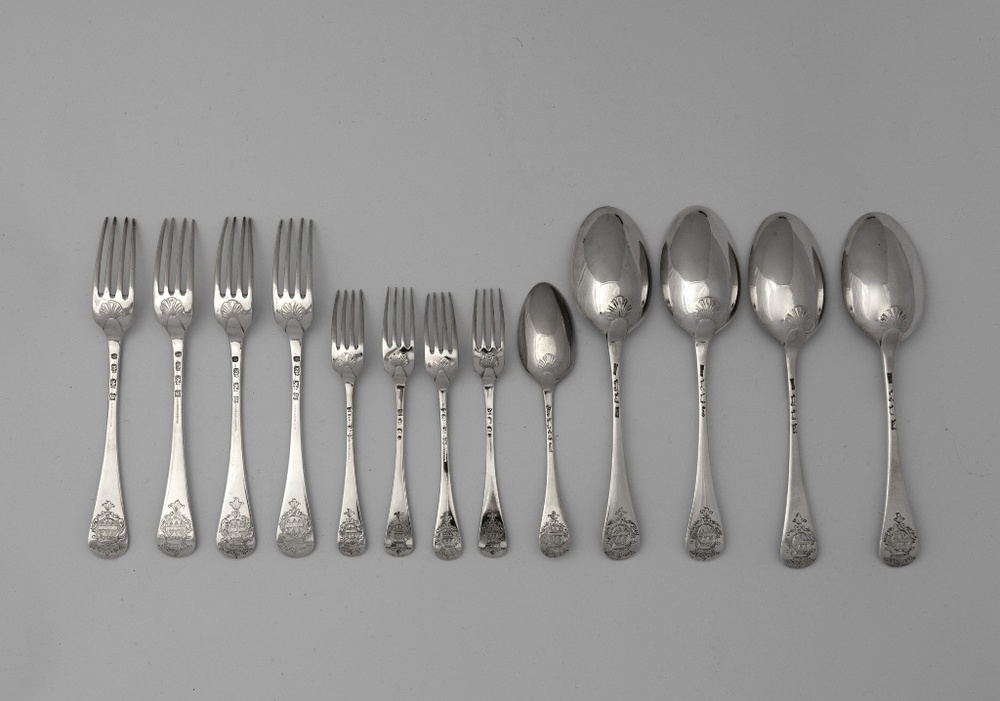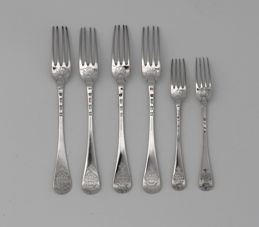 Vier zilveren lepels en vorken met vrouwelijk wapen van Vegilin van Claerbergen
