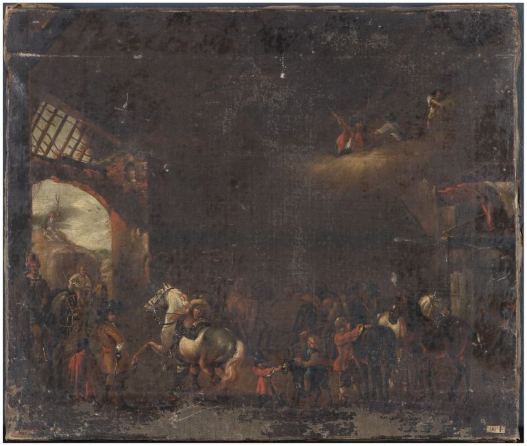 Gezicht in schuur, mannen, ruiters, paarden e.d.