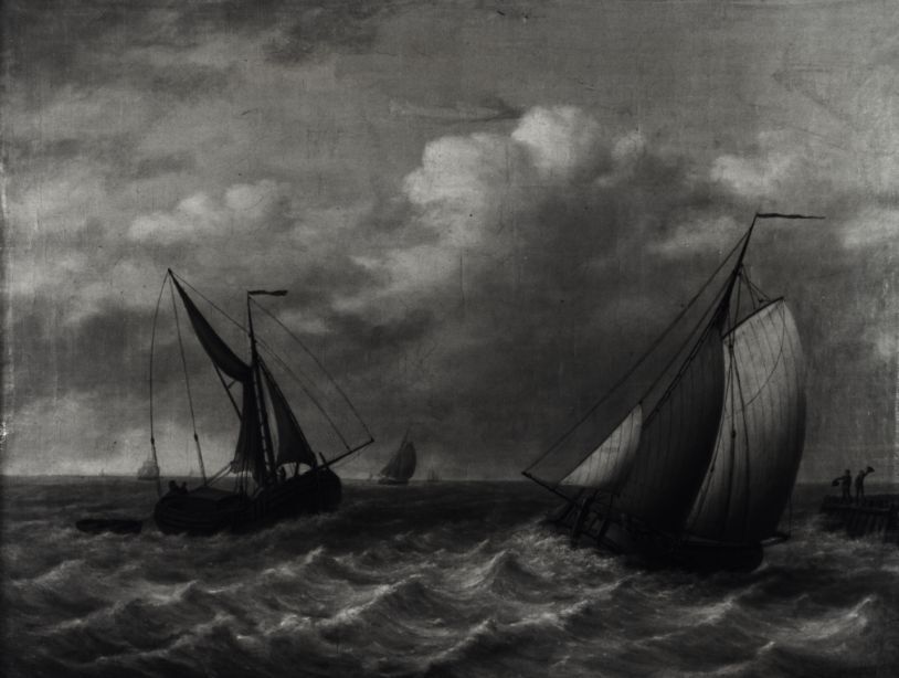 Havenhoofd waarop 2 hoeden-zwaaiende mannen, smak en beurtschip