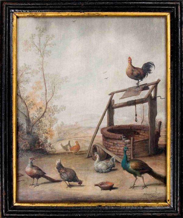 Landschap met vogels bij een waterput, in het verschiet heuvels