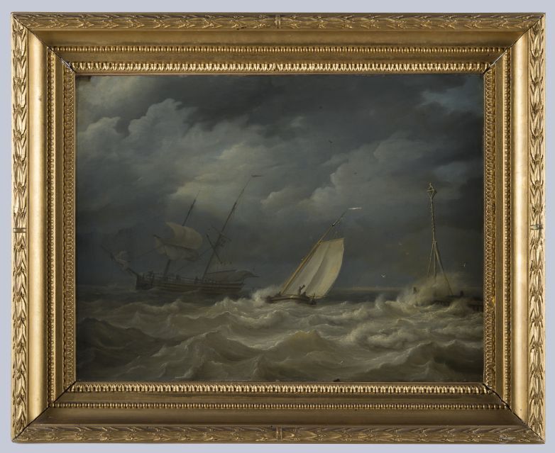 Stormachtige zee met schepen bij een haveningang