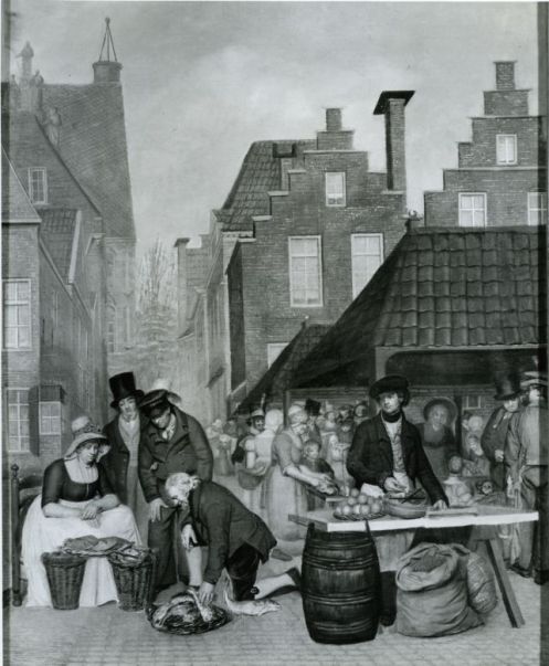 Gezicht op voormalige Vismarkt te Leeuwarden, met doorkijk op Koningsstraat