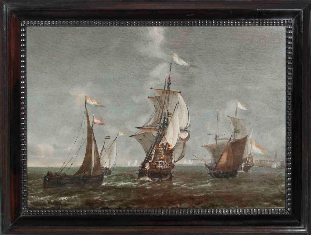 Zeegezicht met zeilend oorlogschip op voorgrond