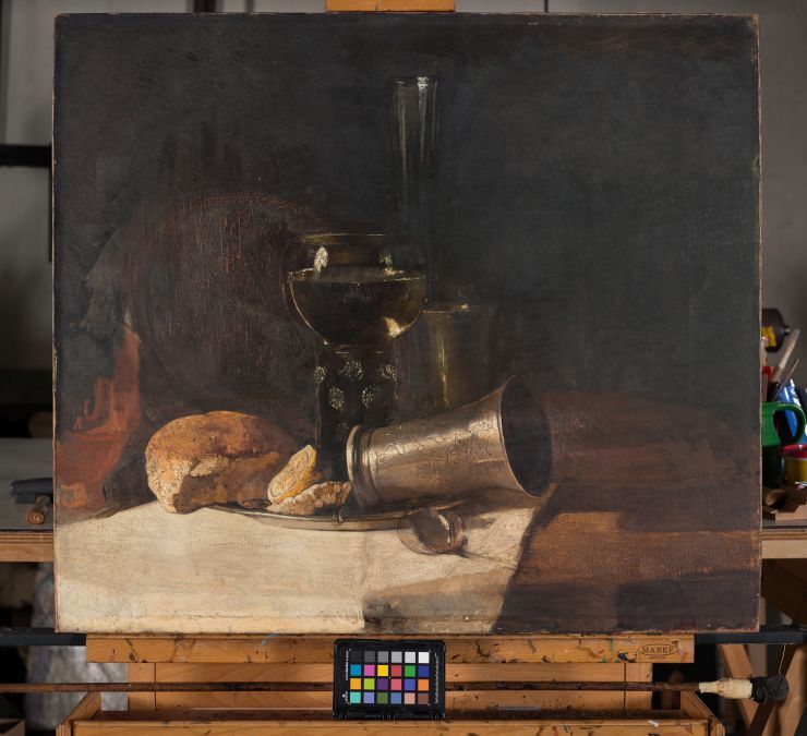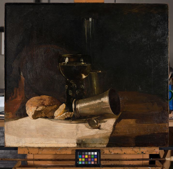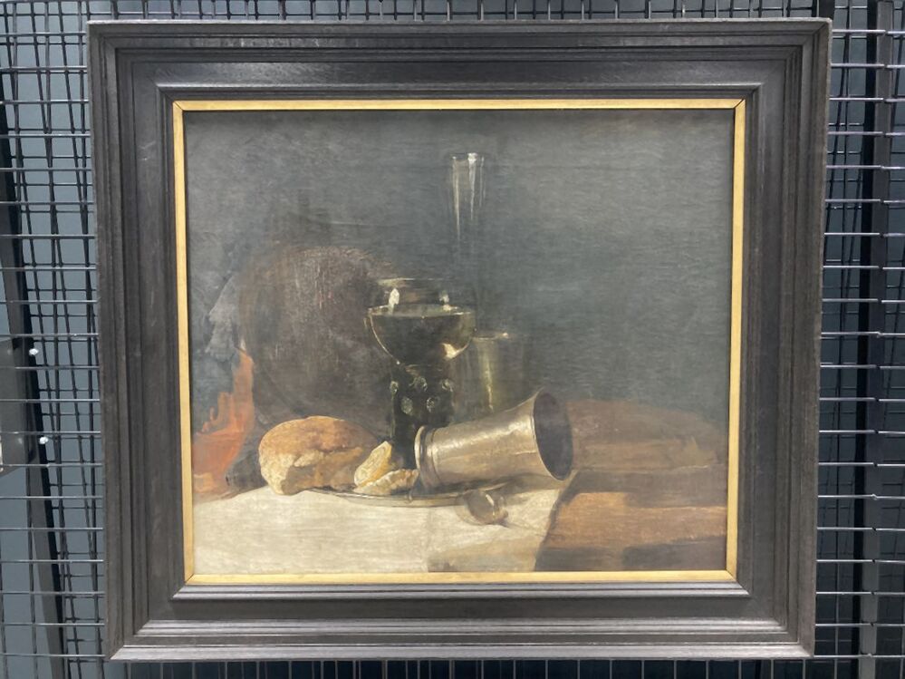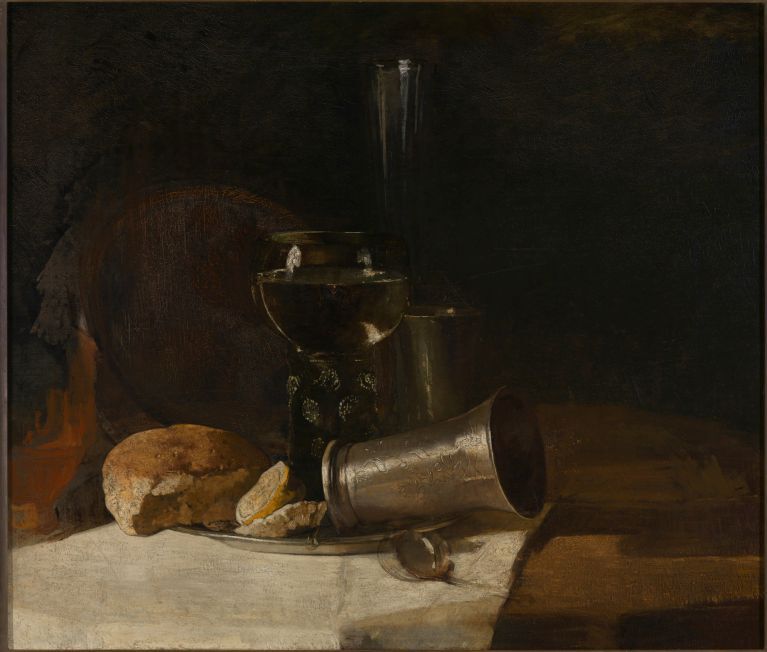Stilleven met brood op tinnen schaal, citroen en drinkgerei
