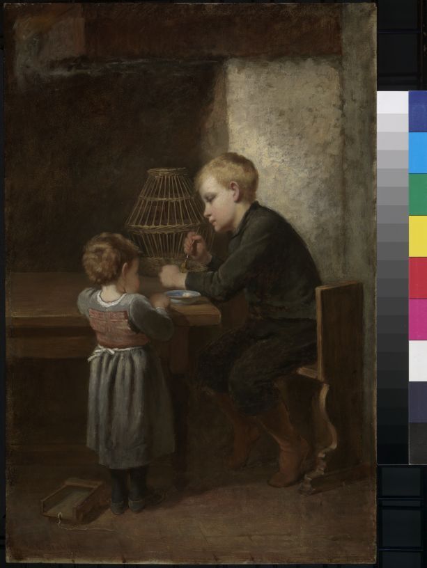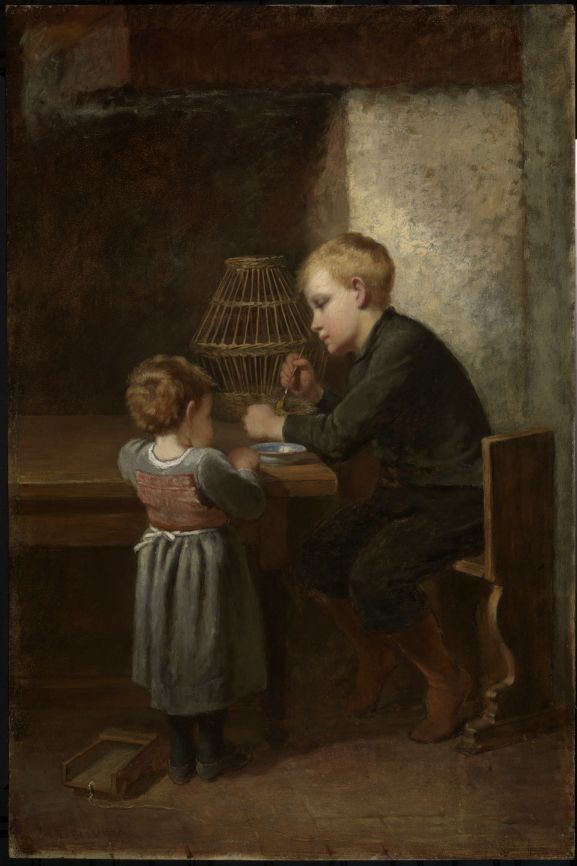 Interieur met tafel waarop vogelkooi en schaaltje