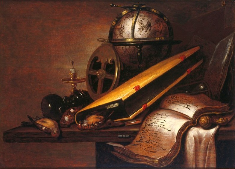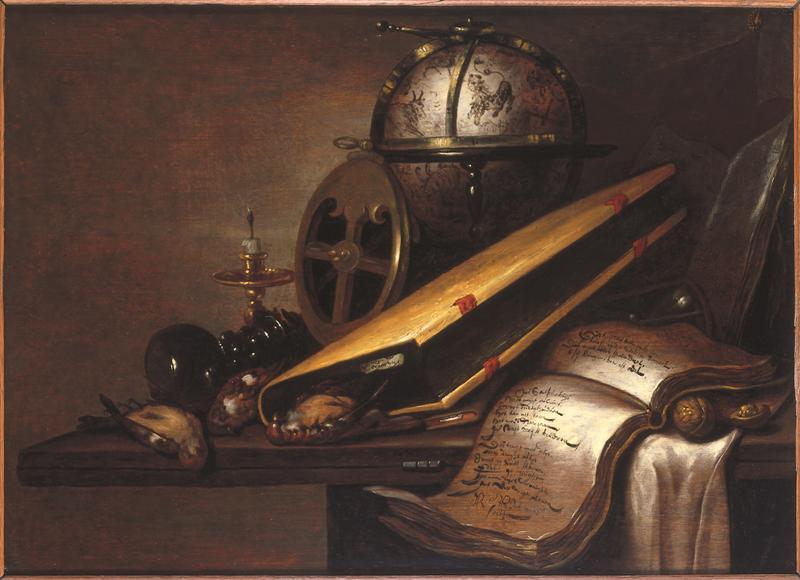Vanitas-stilleven met o.a. boeken, astrolabium en globe