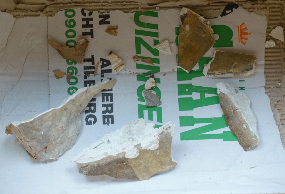 Afgebroken stuk of brokstuk van een object of van een architectuuronderdeel, zoals bijvoorbeeld een los briefpaneel, een handje van een beeld, een stuk van een staf of een kandelaar. Bewaren! Ze zijn onderdeel van de kerkelijke historie en onmisbaar bij conservering en restauratie.