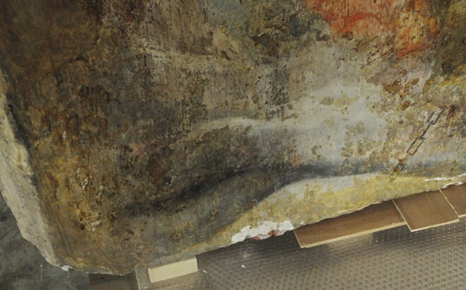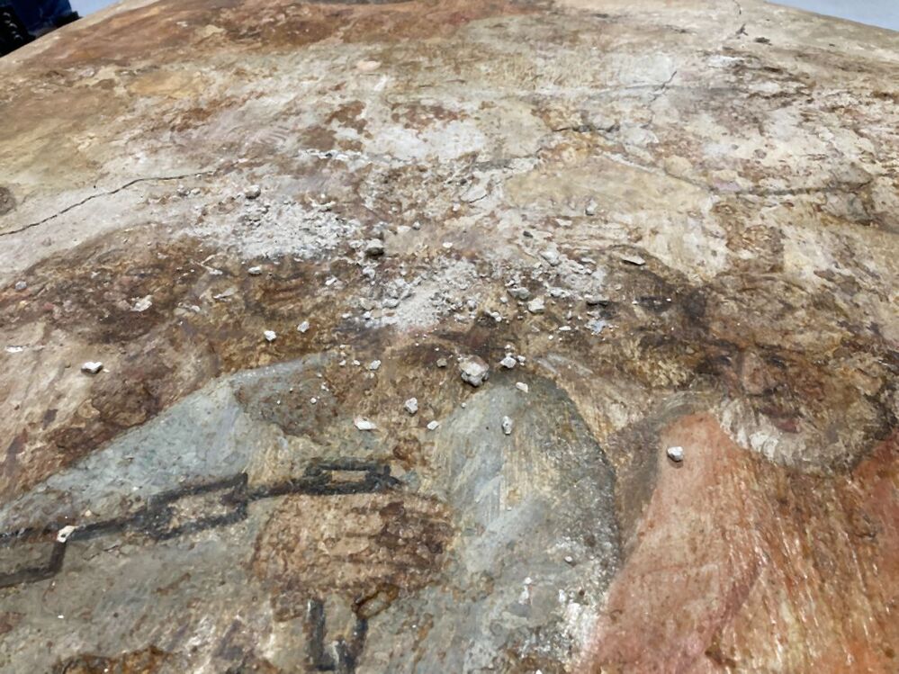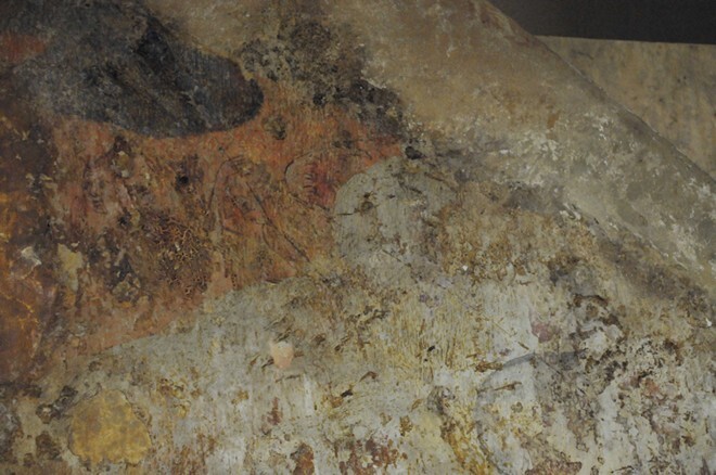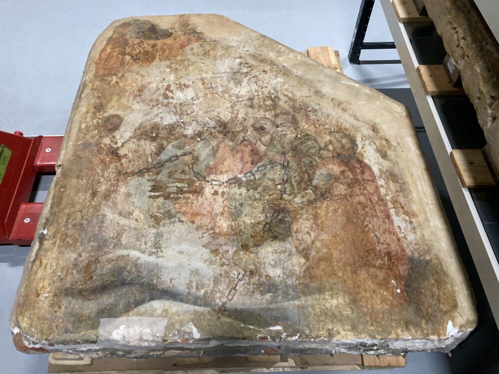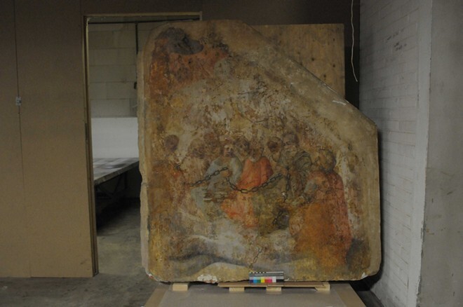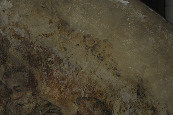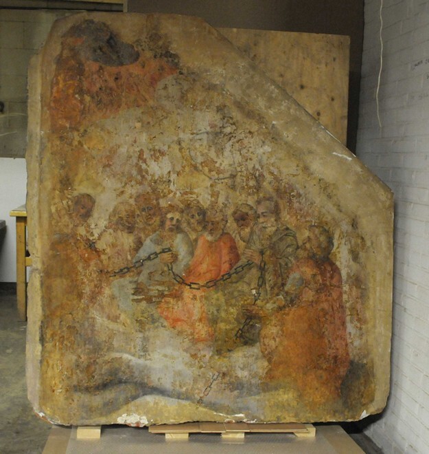Hemelbewoners houden de ketenen van de gemeenschap der heiligen (fragment muurschildering Galileërkerk)
