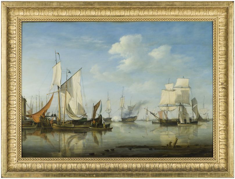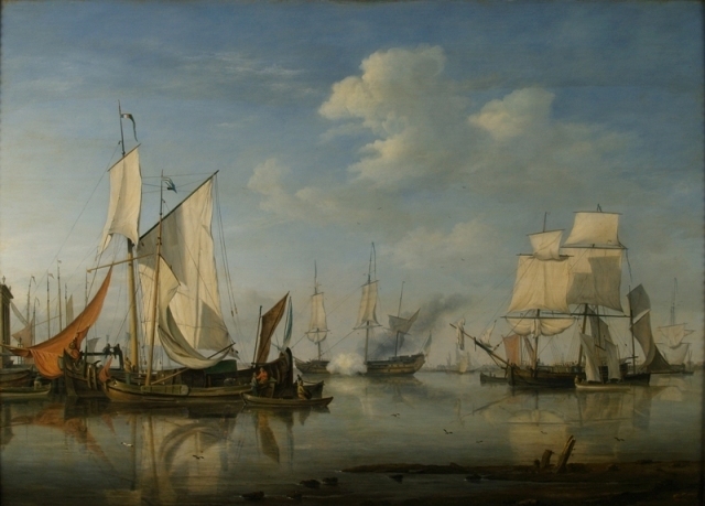 Zeegezicht met kalme zee met vele schepen.