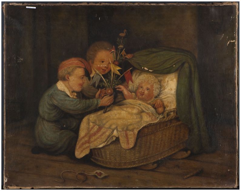 Twee kinderen met palmpaas bij een wiegje met kind