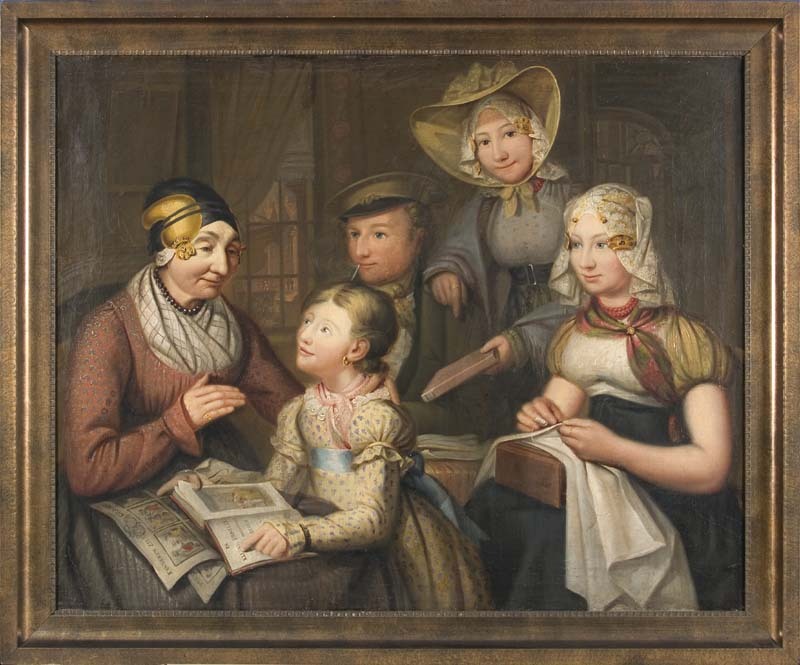 Groepsportret van Saapke Posthumus-Goslings, met twee dochters, een zoon en een kleindochter